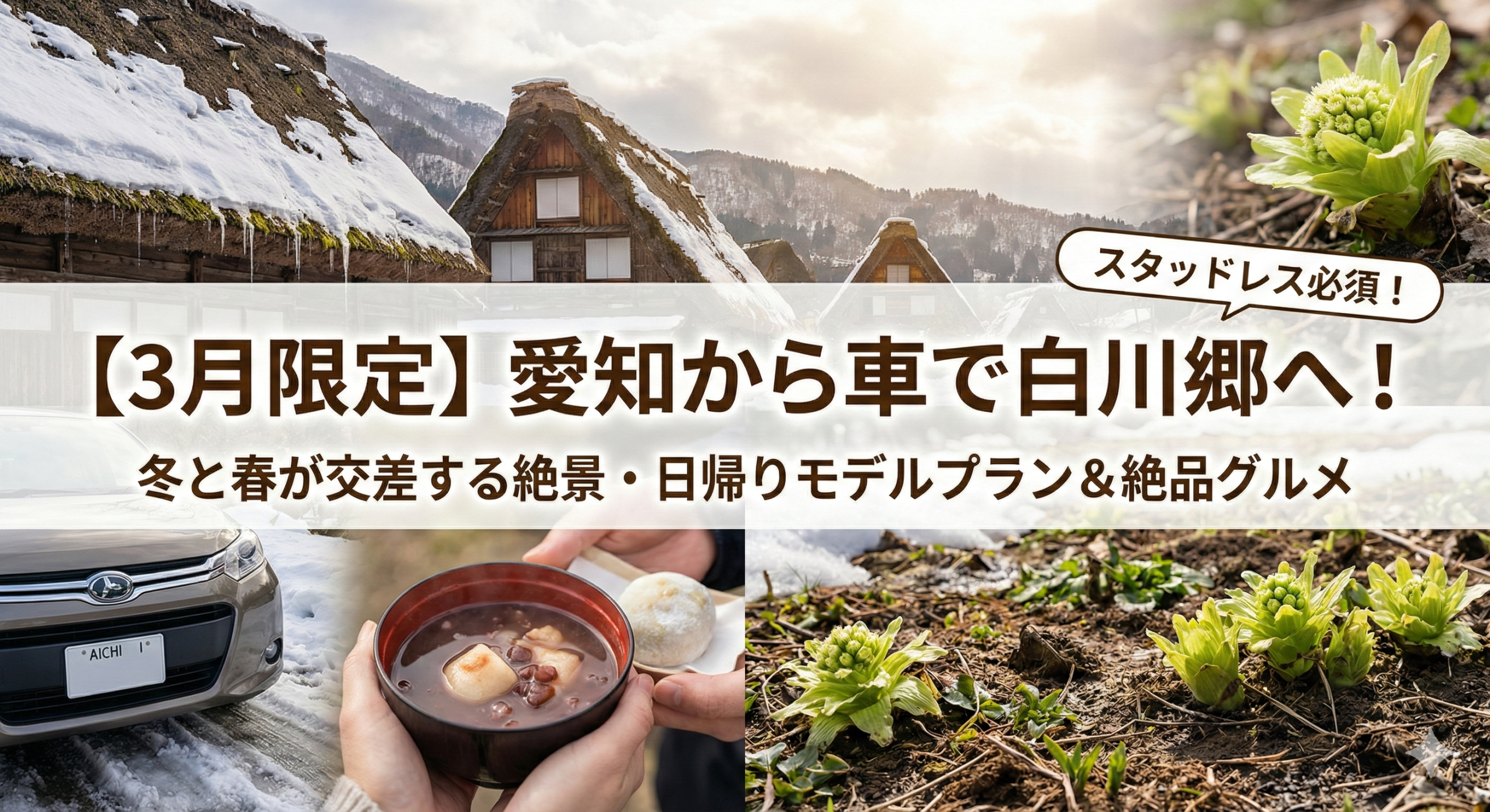 3月の白川郷周辺は、まだまだ雪国の顔を持っています。スタッドレスタイヤの装着やチェーンの携行など、車の雪対策だけは絶対に怠らないでください。 安全な足元と暖かい服装を用意して、心ゆくまでこの「冬と春の交差点」を楽しんできてくださいね!