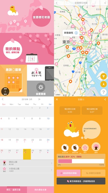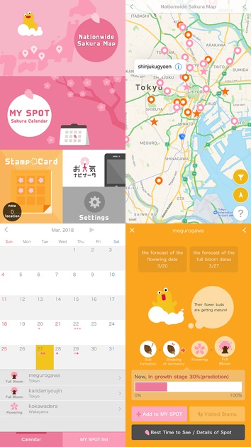 2018年シーズンの国内の桜の名所の開花・満開予想日や、開花状況がわかるiOS・Android対応アプリで、これまで日本語のみ提供していましたが、3月5日に英語、中国語(繁体字)での提供を開始しました。使用している情報は、日本気象独自の開花予想や生長情報を用いています。