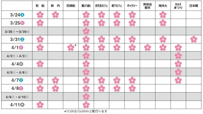 ■お花見周遊船【和船】:3月24日(土)、 25日(日)、 31日(土)、 4月1日(日)、 4日(水)、 7日(土)、 8日(日)、 11日(水)9:30~14:30受付